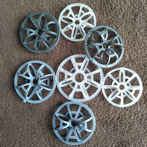 塑料花环填料早是由美国A.J.Teller于1954年研制开发出来的,故而常称之为泰勒花环(TellerRosette)。由于填料的空隙处能有较高的持液量,可使塔内液体的停留时间较长,从而增加了气液两相的接触时间,提高了填料的传质效率。 花环填料也称梅花环填料塑料花环填料是由12个小圆环按径向排列而组成的一个大扁球体,很类似于一个螺旋形弹簧首尾相接绕成的一个圆球体。有的小圆呈A字;有的在小圆和大圆边沿还带有齿;有的外围没有大圆圈,只有里面的小圆组成等,客户可根据各自的要求订购不同种类的花环。