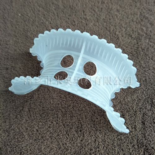 塑料异鞍环是20世纪70年代美国Noton公司对普通矩鞍环填料作出了改进,其特点是将扇形弧面改进成带锯齿边缘的贝壳状弧面,并在鞍背上增加了开孔,这样填料层内的通道更加通畅,改善了液体分布性能,降低了气体通过的阻力,提高了传质性能。塑料异鞍环鞍形填料类似于马鞍形状,这种填料层中主要为弧形的液体通道,填料层内的空隙较环形填料(尤其较拉西环填料)更加连续。